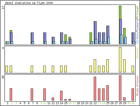 | Den | Přístupů | Souborů | Stránek | Návštěv | Objem přenosu |